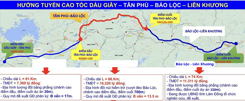 Đoạn cao tốc Bảo Lộc – Liên Khương tiếp nối cao tốc Tân Phú – Bảo Lộc, có chiều dài khoảng 74 km, quy mô 4 làn xe, dự kiến tổng mức đầu tư 19.521 tỷ đồng. Trong đó, vốn Nhà nước tham gia 7.761 tỷ đồng, phần vốn sở hữu các nhà đầu tư là 11.760 tỷ đồng, vốn huy động khác khoảng 9.996 tỷ đồng. Điểm đầu tại Km126+360, giao với đường Nguyễn Văn Cừ, TP Bảo Lộc (điểm cuối dự án Tân Phú – Bảo Lộc); điểm cuối tại Km200+000 giao với cao tốc Liên Khương – Prenn tại Km208+650, huyện Đức Trọng.